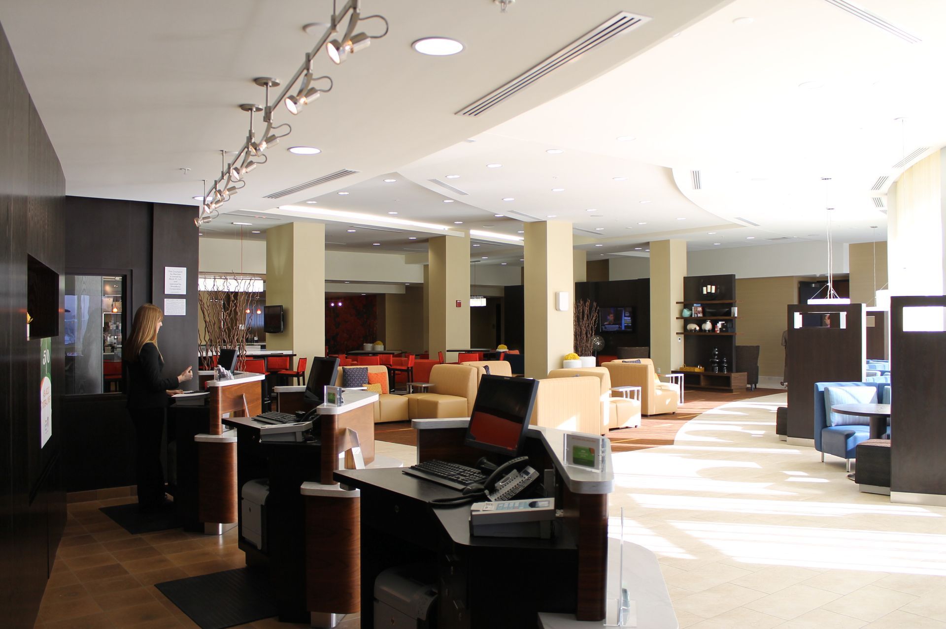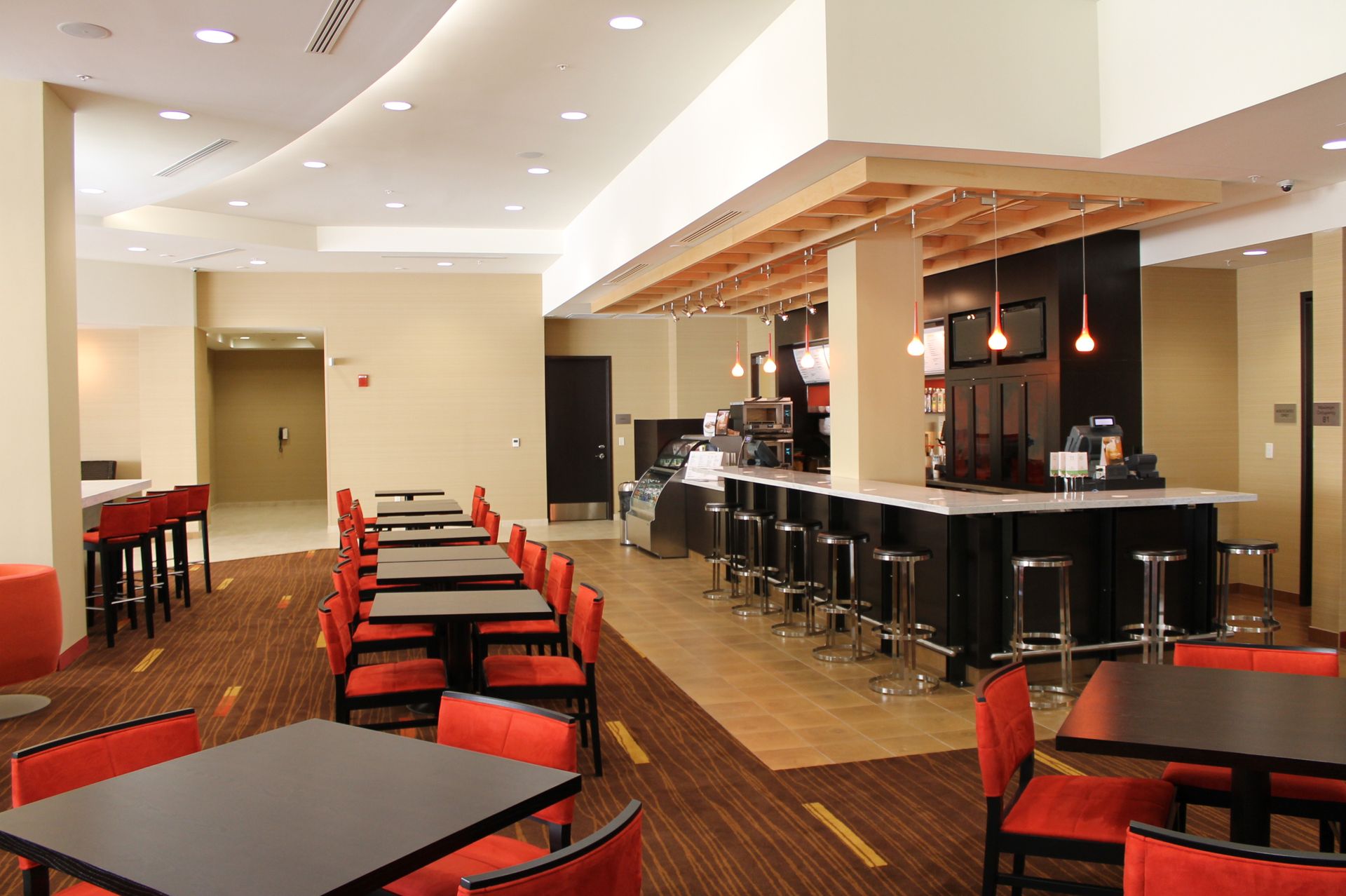 Located a few blocks from the heart of Lincoln’s historic Haymarket area, the Courtyard Marriott Hotel is geared for the weekday business traveler and weekend leisure adventurist. With combined hotel and retail space, the hotel consists of six levels and a lower level. The lobby was designed for the traveler – with work pods and flexible seating, Wi-Fi and terminals dedicated to checking airlines and flight information. ‘The Bistro’ provides beverages, healthy meal options and evening cocktails. One hundred and fifty five guest rooms range in size from standard, two queen, and king suites, which offer a separate sleeping area from the main room. An exercise room and swimming pool are located in the basement. The property includes retail space with a separate entrance, currently occupied by Blue Sushi Sake Grill restaurant.